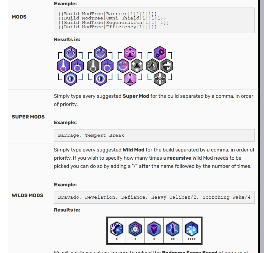 | WILDS MODS | Simply type every suggested Wild Mod for the build separated by a comma, in order of priority. If you wish to specify how many times a recursive Wild Mod needs to be picked you can do so by adding a "/" after the name followed by the number of times.